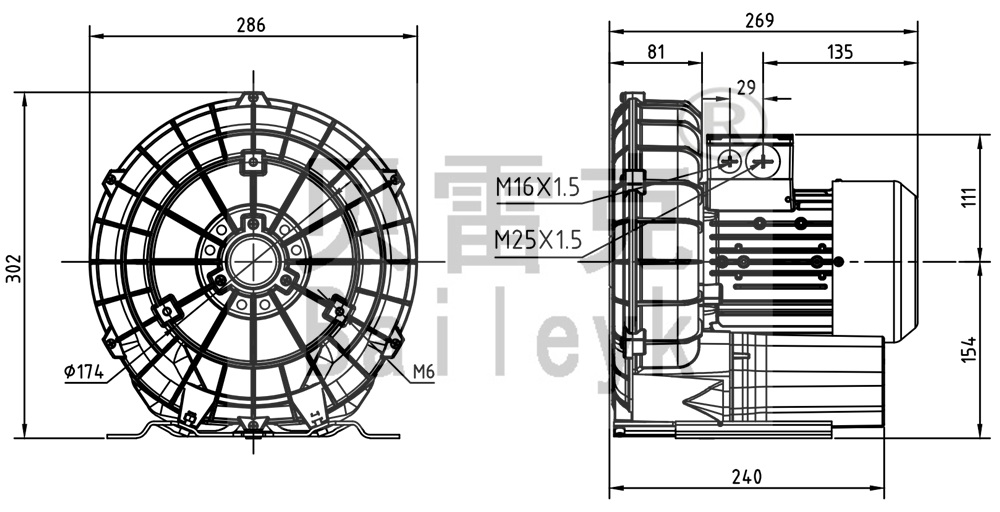 最大風(fēng)量:145m3/h 最大正壓:120mbar 最大負(fù)壓:120mbar 防護(hù)等級:IP55 噪音:63db 重量:15Kg