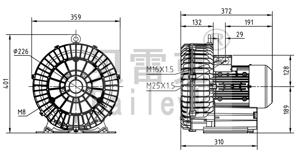 最大風(fēng)量:345m3/h 最大正壓:195mbar 最大負(fù)壓:200mbar 防護(hù)等級:IP55 噪音:70db 重量:29Kg